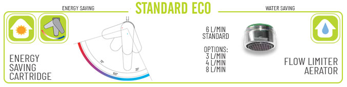 CARTUCCIA A RISPARMIO ENERGETICO ENERGY SAVING: una specifica cartuccia che permette di aprire in sola acqua fredda quando la leva si trova in posizione allineata rispetto alla bocca del rubinetto. Questa nuova cartuccia evita la richiesta indesiderata di acqua calda, permettendo perciò un risparmio energetico.