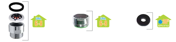 AERATORE A RISPARMIO IDRICO CON LIMITAZIONE DI PORTATA: portata dell'acqua limitata, con riduzione della portata massima sulla rubinetteria a scelta tra 8, 6, 4 e 3 litri al minuto.